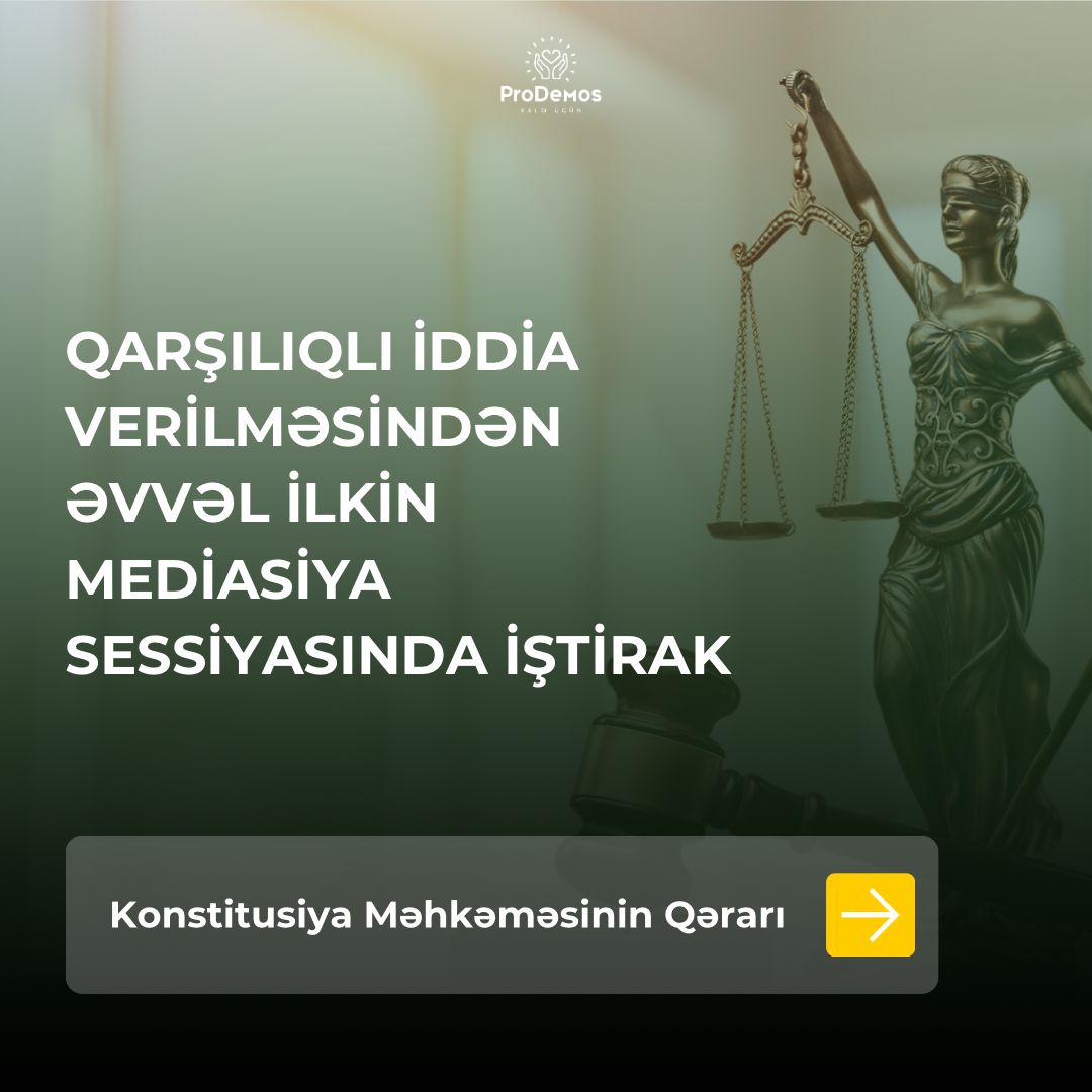 Konstitusiya Məhkəməsinin mövqeyinə əsasən, Mülki prosessual qanunvericilikdə cavabdeh üçün nəzərdə tutulmuş prosessual müdafiə vasitələrindən biri də Mülki Prosessual Məcəllənin (MPM) 155-ci maddəsində müəyyən edilən ilk iddia ilə birlikdə baxılmaq üçün iddiaçıya qarşılıqlı iddia vermək hüququdur. Mediasiya isə mübahisələrin məhkəmədən kənar alternativ həlli yolu olmaqla tərəflər arasında münaqişə səviyyəsinin azaldılması, məsələlərin tərəflərin öz iradə və istəklərinə uyğun, qarşılıqlı kompromis əsasında həll edilməsi məqsədini daşıyır. Bu səbəbdən, ilk iddia üzrə mediasiya prosesinin keçirilməsi və barışığın əldə edilməməsi qarşılıqlı iddia üzrə yenidən mediasiyanın keçirilməsi zərurətini aradan qaldırır. Qarşılıqlı iddianın öz-özlüyündə müstəqil mövcud olmaması, yəni onun verilməsi üçün mütləq qaydada ilkin iddianın olması və ilkin iddianın verilməsi zamanı MPM-in tələblərinə əməl olunması qarşılıqlı iddianın verilməsi zamanı həmin tələblərə əməl edilməsini lüzumsuz edir.